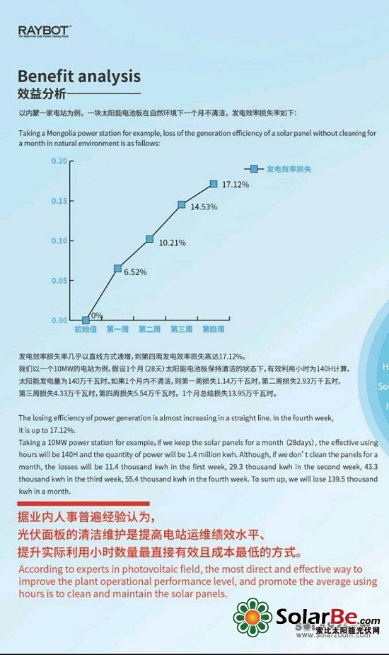 以上就是我的计算思路和方法。当然,这里面有个重要的前提是我们必须要一年365天,天天干满7小时。这显然是不可能的嘛,所以我们要自己判断我们的工作量的饱和率究竟是多少。但是作为投资方,您就要考虑这个问题了,您得看您手上的电站资源,需要多少个这样的基本工作单元能保证机器人的利用率达到一定的高饱和度,例如70%。以一年有30%的时间不干活为例,您的成本就变成了0.11x1.07=0.12元/平方米。