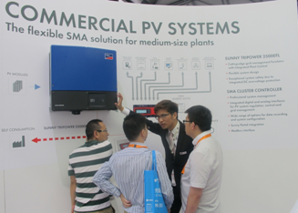此次SMA在展会上首次面对中国市场和客户展出其中压集成平台产品MVPS 2.1以及组串式系列逆变器产品。MVPS 2.1目前是世界上最轻巧最小的敞开式集装箱中压逆变设备。自2014年推出此产品的2年以来已经在全世界各地超过了上千台的安装量,总安装容量2GW。