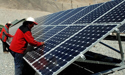 5月1日,在珠峰大本营打工的西藏定日县扎西宗乡农民工在擦洗太阳能光伏板。珠峰大本营3月20日建起由72块太阳能光伏板组成的光伏小电站,其功率达到10千瓦,每天可以产生60多度电。这是第一次在海拔5200米的珠峰大本营大面积使用太阳能发电设施。