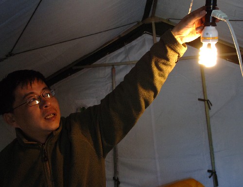 珠峰大本营工作人员用节能灯泡照明。珠峰大本营3月20日建起由72块太阳能光伏板组成的光伏小电站,其功率达到10千瓦,每天可以产生60多度电。这是第一次在海拔5200米的珠峰大本营大面积使用太阳能发电设施。