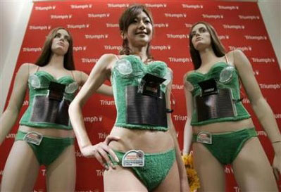 14日,一家日本内衣公司展示了一款绿色环保胸罩——太阳能胸罩。这种太阳能胸罩产生的能量可以为一部手机或一部大容量音乐播放器供电。