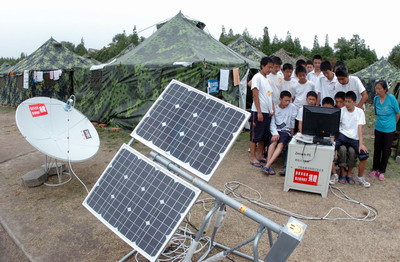 5月30日,在绵阳北川中学临时安置点,学生们围在电视前,正在用国家科技部和四川省科技厅共同捐赠的太阳能卫星电视和应急照明系统观看中央电视台关于地震原理和救生防护的科普宣传片。