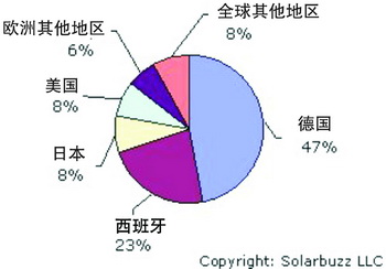 欧洲,尤其是德国在太阳能市场中具有较强的实力,这得益于以强制入网电价为基础的良好政策,这一政策已经成为全球效仿的范例。德国已经达到了1328MW的光电装机总量,占全世界装机总量的47%。德国国内生产的太阳能电池只能满足50%的国内需求,因此德国不得不大量进口太阳能电池,主要进口来源是亚洲尤其是中国。西班牙是2007年最具活力的太阳能市场,其装机容量增长了480%,达到了640MW。意大利也是一个极具吸引力的市场,当地政府效仿德国的模式,为太阳能的应用提供了补贴。由于意大利的光照水平比德国高1.5倍,而且传统发电的成本更高,因此即使没有政府补贴,太阳能在意大利相比在其他国家有可能更快地凸显出竞争力。美国市场实现了57%的增长率,达到了220MW的装机容量。这些系统中有大约75%安装在加州。曾经处于世界领先地位的日本厂商发展缓慢,总共只有26%的市场份额。相反,2007年中国厂商的市场份额却从20%增长到35%,今年的太阳能发电量将超过欧洲和日本。中国市场的增长速度是非常惊人的:2003年,中国的太阳能发电量只占全球的1%。