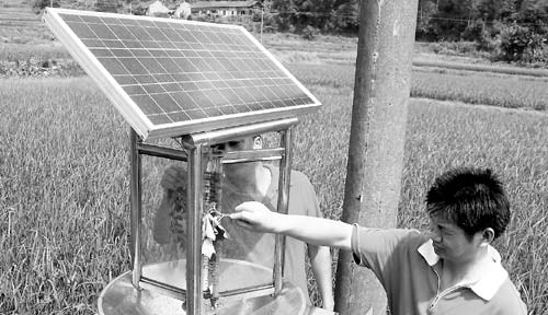 7月18日,调查人员在江西宜丰县双峰绿色水稻基地检查太阳能灭虫灯的应用情况。该县建立10万亩绿色水稻基地,在13个核心示范区运用频振灯杀虫、香根草诱杀虫、稻鸭共栖等病虫害绿色防治技术,并首次使用了太阳能灭虫灯,取得了良好的防治效果。