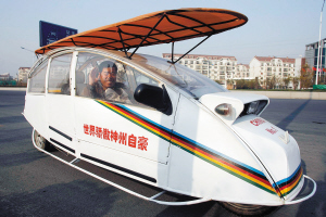 天津市民李立群自主设计制作了一辆双动力环保汽车,该车为电瓶和太阳能混合动力,太阳能和电瓶自由转换,最高时速达每小时60公里。