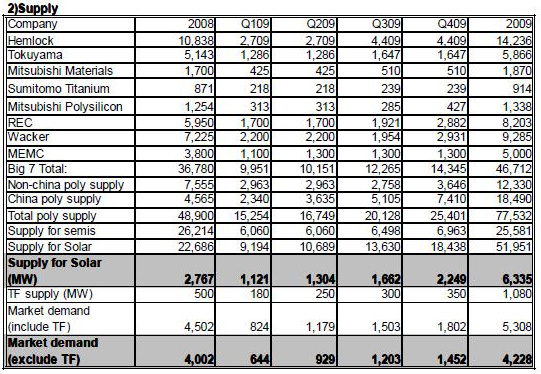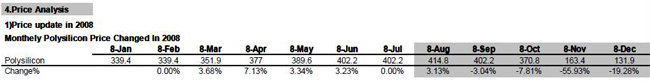 Virgin Polysilicon:Due to demand and financial crisis,Average price for virgin polysilicon dropped approximately 68.2% from Aug 414.8$ dropped to Dec 131.9$.