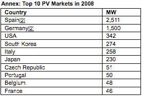 “西班牙以2.5GW的新产能,在08年占据了全球新布建太阳能光伏总规模的五成;德国则是以1.5GW的新建置并网发电系统(connected systems),紧随其后。”EPIA表示,美国去年的新建置太阳能光伏产能规模则为342 MW;接下来是韩国,08年新建置产能为274MW。