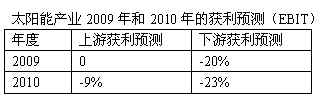 以目前可能开出的产能预测,太阳能电池厂的产能利用率将从2008年的74%调降为2009年的36%,2010年35%;硅片公司则是2008年的99%调整为2009年的69%;短期过多的产能连带也使许多包括挪威Renewable Energy Corp.和德国Q-Cells在内的几家大型太阳能企业都下调了原来的利润和收入目标。UBS分析师预计2009年太阳能电池的平均价格将仅为每瓦2美元,大大低于2008年的3.95美元。而高盛则调整了太阳能产业2009年及2010年的获利预测数据(EBIT),如下表。