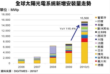 在2010年第3季主要太阳能厂产能利用率逐渐明朗的态势下,DIGITIMES Research大幅调升2010年太阳光电新增安装量至15.5GWp,较2010年大幅成长115.4%,预期其他市场的旺季需求将抵销德国下调补助的影响,德国、义大利与捷克在第4季结束前的拉货潮,仍为2010年太阳能光电市场最大的成长动能。