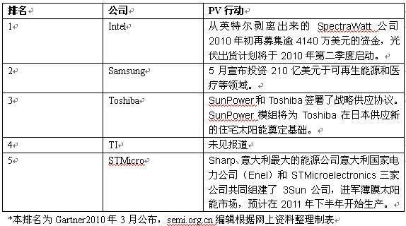 一针见血的两句话总结了半导体与光伏、LED产业的今天,也是对延续摩尔定律的艰难与“More than Moore”快速发展的最好诠释。半导体技术的发展到了瓶颈,也许并非是技术没有发展的空间,而只是因为研发投入和产出不成比例,导致很多公司退出了继续走向32nm或22nm的舞台,与此同时开始开拓相关领域。产业链上的不少设备材料公司也似乎将更多的“心思”放在了拓展新领域上。今年,我们发现不少传统半导体公司在光伏领域异常活跃,为光伏产业注入了不少半导体行业的理念,带动了技术的快速进步,也为传统PV公司也带来了小小的冲击。让我们看看Top 5半导体公司的2010年“PV行动”吧。
