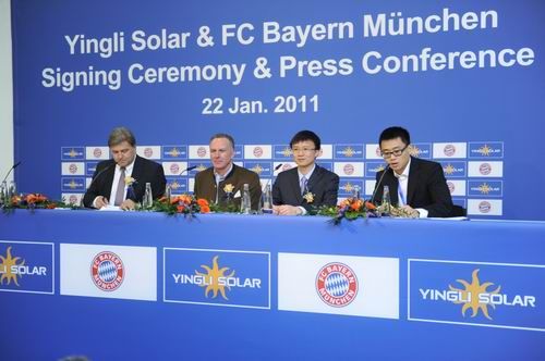 2011年1月22日,英利绿色能源控股有限公司宣布公司正式成为德国拜仁慕尼黑足球俱乐部的官方高级合作伙伴。合作时间为2010/2011下半赛季,直至2013/2014赛季结束,共计3个半赛季。通过此项合作,英利绿色能源将在市场营销领域获得票务和客户款待权益,广告/媒体公关权益以及在拜仁官方球迷商店进行销售的权益。与此同时,协议授权英利可以使用拜仁的标识进行相关宣传,并且可以在安联球场举办公关活动。