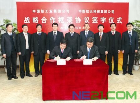2月15日,中国核工业集团公司与中国航天科技集团公司在中国原子能科学研究院举行战略合作协议签字仪式。工业和信息化部副部长、国防科工局局长陈求发出席签字仪式。中核集团总经理孙勤、航天科技集团总经理马兴瑞分别代表双方签署协议。