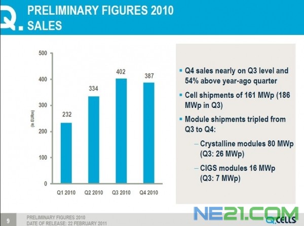 报告称Q-Cells第四季度的销售额为3.87亿欧元,同比增长54%,几乎与2010年第3季度的高销售额持平。