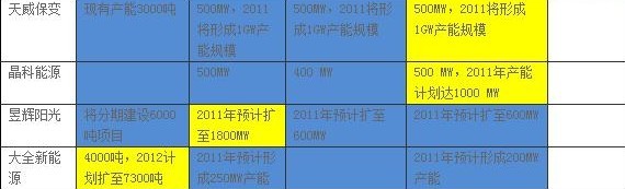 2011年,天合光能(TSL,29.07,-4.38%)除将扩产组件产能外,该司近日宣布计划在常州天合光伏工业园投资8亿美元,并在2011-2013年期间扩大产能。去年年底,在天威新能源的年会上,总经理高正飞表示:“2010年底天威二期项目全面投产,硅片、电池、组件的产能都达到500MW,目前三期项目已经启动,2011年将形成1GW的产能规模,2012年硅片、电池、组件产能将达到1.5GW。”