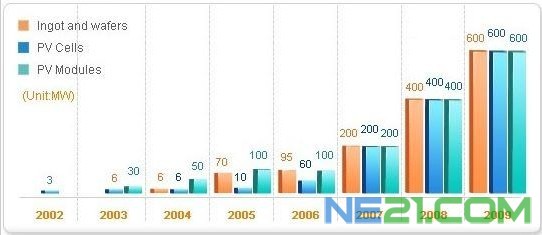 南玻集团,2010年预期电池片产能达到100MW、组件120MW,年营业额8亿元,2011年电池片、组件各300MW,年营业额期望做到30亿元。