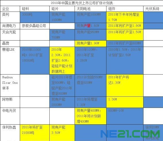 还有赛维LDK,垂直一体化的产能计划也是相当全面,2011年硅料产能计划18000吨、硅锭2.6GW、硅片2.6GW,对于目前占其总业务量份额不大的太阳电池及组件,计划扩产产能也分别为1.26GW和2.5GW,这是很惊人的扩张速度。