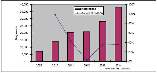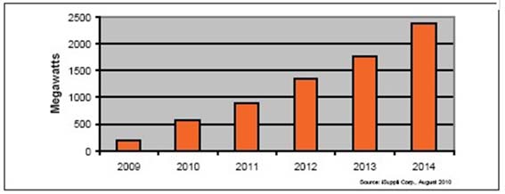 图:iSuppli 对2009-2014年全球光伏装机容量预测