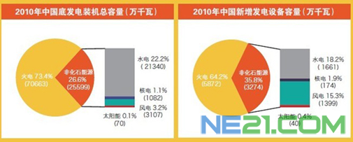 截至2010年年底,我国火力发电在总装机量中仍占主导地位。非化石能源装机比重合计占26.6%,比上年提高1.1个百分点。
