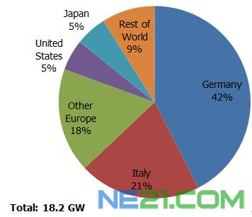 2010年,全球前五大光伏市场国家为德国、意大利、捷克共和国、日本与美国,这五个国家占据了全球80%的需求。欧洲区域前三大光伏市场国家依序为德国、意大利与捷克共和国。