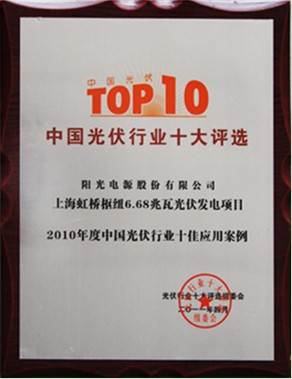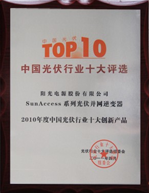 4月12日,“2010年度中国光伏行业十大评选”在南京揭晓,阳光电源股份有限公司的SunAccess系列光伏逆变器入选“2010年度中国光伏行业十大创新产品”。同时,使用该逆变器的上海虹桥枢纽大型光伏发电项目也同期入选“2010年度中国光伏行业十佳应用案例”。