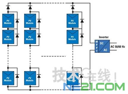 | 图1 采用集中式MPPT技术的并网太阳能光伏系统 |