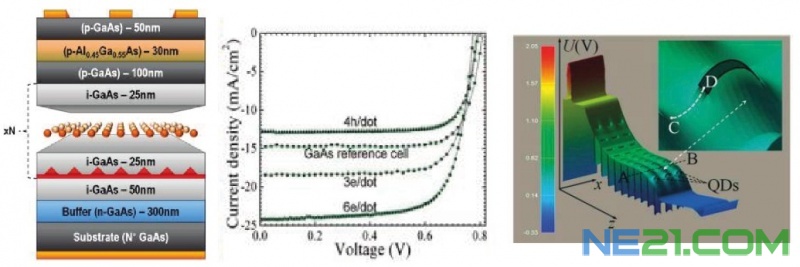 在他们的研究中,研究人员探讨了异质结构太阳能电池与砷化铟/砷化镓量子点。作为光伏材料,量子点可以利用红外辐射(infrared radiation),把它转化为电能。但是,量子点又提高了载流子(photocarriers)重组,降低了光电流(photocurrent)。出于这个原因,直到现在,采用量子点提高光伏效率,一直局限于几个百分点。