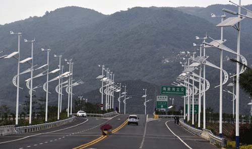 国家海岸•三亚海棠湾总路网建设达180公里,目前已建成的海棠湾A、B、C、D、E路作为海棠湾开发建设的主要框架道路,共安装全永磁悬浮风光互补路灯1028盏,太阳能庭院灯695 盏。这些路灯照明全部实现无污染、零电费,是目前全国第一条规模化完全应用新能源发电的路灯照明道路,为三亚市政府实现“海棠湾绿色照明,节约能源,最大限度地利用可再生能源”的目标作出了积极贡献。同时,全永磁悬浮风光互补道路照明系统还与海棠湾“国内唯一一个国家级度假海岸——国际休闲度假区”的形象和地位匹配,也符合国家当前正在推广的低碳经济模式和资源节约型环境友好型的社会发展需求。