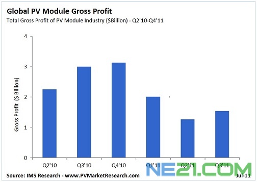 据IMS估计,2010年每个季度全球光伏组件供应商毛利润总额为25亿美元,然而到2011年一季度、二季度已相继下滑至40%。预计到今年下半年需求量将出现反弹,供应商们的利润率也将有所回升。IMS预测到今年三四季度组件供应商的毛利润将再次上涨。
