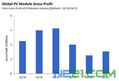 IMS Research的高级市场分析师Sam Wilkinson表示:“做垂直整合的中国一级晶硅光伏组件供应商们拥有最具竞争力的成本结构,2010年他们的毛利率高达20%。利润在2010第三季度到达最高峰,自那之后开始下降。目前的价格水平对这些供应商的利润造成了巨大的压力。我们相信到2011年第三季度,他们的平均毛利率将下降到20%以下,而二级供应商的利润甚至会更低。”