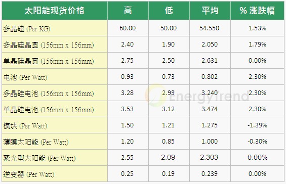 本周调查结果显示,上游的多晶硅平均成交价来到$54.55/kg,涨幅为1.53%。在硅外延片方面,多晶硅外延片平均价格微幅上扬到$2.05/piece,涨幅为1.79%。而单晶硅外延片本週平均价格仍维持在$2.631/piece,与上周相同。另一方面,太阳能电池的需求受到市场需求转向的影响,高效率产品的需求仍维持热络,售价也维持相对高档;但在转换效率偏低的产品方面,交易价格面临较大的压力,然而本周电池平均价格上涨到$0.802/Watt,涨幅为2.3%。而在模组市场方面,平均交易价格滑落到$1.275/Watt,跌幅为1.39%。另一方面,薄膜市场价格受到印度市场价格影响,出现微幅滑落,目前价位在$1.000/Watt,跌幅为0.3%。