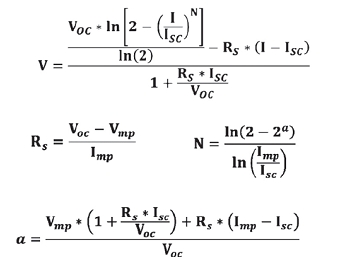 为了能够精确仿真太阳能电池板在特定环境条件下的输出(特别是对于小功率逆变器,仿真精度的要求往往更高),很多厂家推出了专用的太阳能方阵模拟器,用于模拟各种环境下太阳能电池板的输出特性,精确地复现出不同环境条件下的I-V输出特性曲线。I-V曲线的数据多来自于用户对太阳能电池板输出的实际测量结果。为了简化操作,目前国际上通用的曲线设置方式是:通过I-V曲线上的四个特征值,即Voc(开路电压值)、Isc(短路电流值)、Vmp(最大功率点电压值)、Imp(最大功率点电流值)来拟合得到完整的I-V曲线。所使用到的公式如下所示: