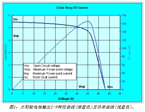 在上述公式的指导下,在太阳能方阵模拟器内部可以精确的建立一条I-V曲线,用来仿真某一特定环境条件下太阳能电池板的输出,如图1所示。无论负载如何改变,太阳能方阵模拟器的工作点将始终位于这条曲线之上。