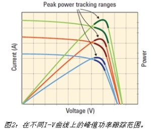 如果目标是为了验证峰值功率追踪电路的性能,开发出能在不同环境条件下始终工作在I-V曲线最大功率点上的太阳能逆变器,在电路的设计和开发中就必须考虑峰值功率跟踪范围和跟踪频率。峰值功率跟踪范围是I-V曲线最大峰值功率点附近的一段区间,这也是逆变器峰值功率跟踪电路算法的工作区间,跟踪频率则是工作区间内曲线的摆动速率,如图2所示。为确保逆变器在模块I-V曲线变化时始终能够找到最大峰值功率点,它必须具有足够宽的跟踪范围和足够高的跟踪频率。为验证设计的有效性,需要根据精确复现太阳能电池板的I-V曲线来验证在不同曲线下逆变器能否稳定地工作在峰值功率点附近。