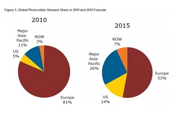 今年第一季度,为赶在即将到期的政府刺激性计划结束前,美国开发商纷纷抓紧安装,使光伏设施安装量达到252兆瓦,比去年同期增长66%。商业和政府项目所占比例为59%,高于去年同期的44%;居住项目所占比例为28%,剩余13%则来自于公用设施级的发电厂。据预测,2011年美国市场的安装量将达到2GW左右,到2015年将增长至6.4GW。从图一中我们可以看出,2015年和2010年相比,美国在全球光伏市场所占比重将从2010年的5%扩大到2015年的14%,而欧洲和亚太地区相应有了很大比例的上升。