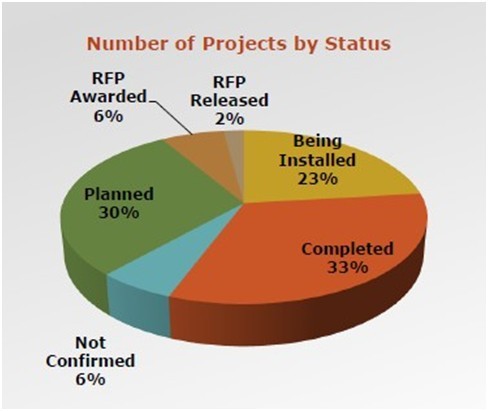据图2所示,截止目前美国已完成安装的光伏项目占33%,规划项目占30%,正在实施安装的项目占23%,仅有6%的项目未得到确认。这样的发展速度也得益于美国政府的支持。目前,美国能源部贷款项目办公室日前已经向分布在28个州地约733MW项目提供了14亿美元的贷款保证,项目总价值约26亿美元。下面我们具体来看一下美国太阳能产业发展具有代表性的地区。