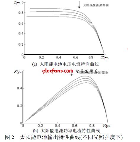 在太阳能发电应用领域中尽可能地提高太阳能电池板的输出功率一直是研究的热点。太阳能电池输出特性为非线性,而且受光照强度和环境温度影响。如图2所示,太阳能电池在任何时刻都存在一个最大功率输出的工作点,而且随着光照强度和温度的变化而变化。为了能够让太阳能电池在供电系统中充分发挥它的光电转换能力,就需要实时控制太阳能电池的工作点以获得最大的功率输出。