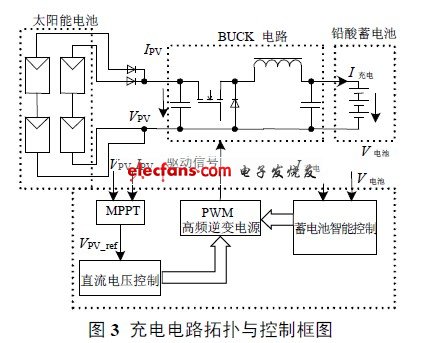 为实现上述充电控制策略,充电电路的硬件拓扑采用了BUCK电路,拓扑与控制示意图如图3所示。在快充阶段,充电电路连接太阳能电池与铅酸蓄电池,通过调整BUCK电路的驱动占空比,达到控制太阳能电池输出电流的目的,最终实现太阳能最大功率点跟踪;在过充和浮充阶段,充电电路仍然调整BUCK电路的驱动占空比,不同的是转为控制蓄电池的充电电流,使之不超过蓄电池的最大可接受电流。