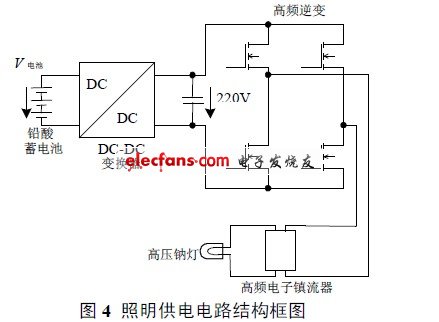 光伏照明系统采用高压钠灯作为照明光源。根据高压钠灯的负载特性,系统中实现了一个高频逆变电源以及与之配合的高频电子镇流器,不仅消除了工频噪音、提高了照明效率,还有效地减小了控制器的