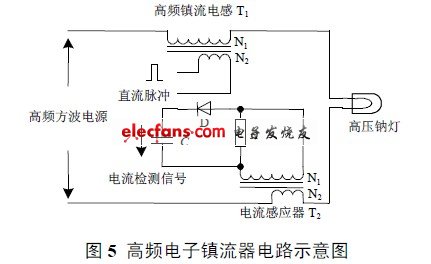 图4是系统实现的高压钠灯照明供电电路结构框图。其中高频电子镇流器的原理示意图如图5所示。通过在镇流电感T1耦合的线圈N2上加上固定时间间隔的直流脉冲,在N1绕组上感应出3000V以上高压,将灯启辉。灯点燃后,电流感应器T2感应高压钠灯电流,产生电流检测信号,关断启辉放电电路。镇流电感采用高频磁芯绕制。提高频率的同时也大大减小了所需镇流器的电感量,从而减小了它的体积和损耗。试验证明,整个高频电子镇流器电路能够稳定、高效工作。