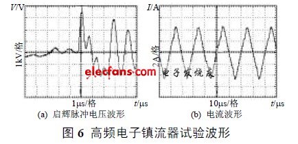 高频电子镇流器工作的试验波形如图6所示。其中(a)为启辉脉冲电压波形;(b)为正常工作时高压钠灯的电流波形。由图可以看出,高频电子镇流器在启辉时可输出3000V,1ms宽的高压脉冲,从而可以将灯可靠启动;高压钠灯启动后,其电流频率为50kHz,超出音频范围,从而消除了音频噪音。