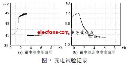 试验还记录了7h的充电中,充电电路在快充、过充、浮充3个阶段中转换过程中的电流、电压波形,如图7所示。从图中可以看出,系统较好的实现了本文所述的能量管理控制。应用此能量管理策略的独立光伏照明系统已经在北京同方广场连续稳定工作12个月,验证了该能量管理系统的稳定性。