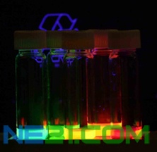 胶体半导体纳米晶体用紫外线照射。量子限制(Quantum confinement)效应导致带隙能量随纳米晶体的大小而变化。每个试管内都有一个分散在液体溶剂中的单分散(monodisperse)纳米晶样品。来源:多伦多大学