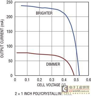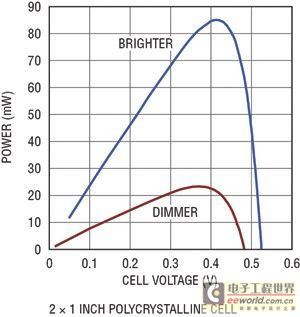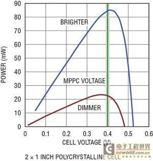为了从光伏电池抽取最大功率,电源转换器的输入阻抗必须与电池的输出阻抗匹配,从而使系统能在最大功率点上工作。图3显示了一个典型的单节光伏电池的功率曲线。为了确保抽取最大功率,光伏电池的输出电压应该与功率曲线的峰值点相对应。LTC3105调节提供给负载的输出电流,以保持光伏电池的电压等于最大功率点控制引脚设定的电压。因此可用单个电阻器设定最大功率点,并确保从光伏电池抽取最大功率和峰值输出充电电流。