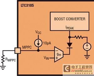 图4显示了LTC3105使用的最大功率点控制机制的模型。图3显示了光伏电池的功率曲线。请注意,当电池电压上升而离开峰值功率点时,光伏电池的功率就会从峰值点急剧下降。因此,一般更希望低于理想值而不是高于理想值的控制电压,因为功率曲线在高压端下降得更快。
