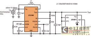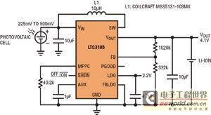 串联连接的高压光伏电池组能提供充足的功率,但单节光伏电池解决方案却很少见,因为单节光伏电池在有负载情况下产生的电压很低,从这么低的电压难以产生有用的电源轨。几乎没有升压型转换器能从电压很低、阻抗相对较高的单节光伏电池产生输出。不过,LTC3105是专门为应对这类挑战而设计。该器件具有超低的250mV启动电压和可编程最大功率点控制,能从富有挑战性的光伏电源产生大多数应用所需的典型电压轨(1.8~5V)。