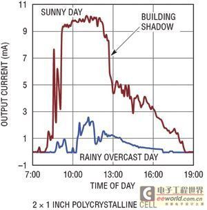 利用图6所示的LTC3105电路和一个2英寸×1英寸的多晶光伏电池给锂离子电池充电,所测得的充电电流曲线如图7所示。图7中上面的曲线显示,在天气晴朗、阳光充足的典型情况下的充电电流;下面的曲线则显示,在阴云密布时观察到的充电电流。即使在这类光照量很低的情况下,在整个白天也能保持250μA或更大一些的充电电流,这相当于给电池提供了总共6mAh的充电。