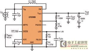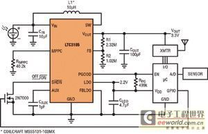 LTC3105是一款完整的单芯片解决方案,适用于从低成本、单节光伏电池收集能量。其集成的最大功率点控制和低压启动功能允许直接用单节光伏电池工作,并确保最佳能量抽取。LTC3105可用来直接给电路供电,或给能量存储器件充电,以允许在黑暗或光照很少时工作。LTC3105使其有可能实现自主远程传感器节点、数据收集系统,以及其他要求不依赖电网和最低限度维护的应用。