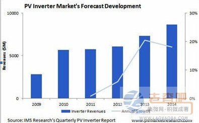 光伏装机量的增长,如果能全部并网,无疑对光伏逆变器市场是一个极大的好消息。其实,目前太阳能发电需求的爆发式增长也将带动光伏逆变器市场的发展,让其成为光伏产业最后一个规模巨大的富矿。IMS Research全球光伏逆变器市场研究最新报告显示,2009年全球光伏逆变器出货量8.3GW,销售收入28亿美元。其中德国,意大利和捷克共和国这三个市场达到了近20亿美元(德国消耗了4.2GW的逆变器,市场销售价值达14亿美元),2010年全球光伏市场达到14.6GW,2011年全球光伏逆变器的新装机量将和2010年持平,销售额达45亿美元。它还预计到2014年,全球光伏逆变器市场将达到85亿美元,年综合增长率近25%。报告还透露,2014年将售出超过700万逆变器,而在2009年还不足100万,并表示未来市场虽然受到价格等影响,但是未来五年仍会翻倍增长。据报道,光伏逆变器目前的市场规模为430亿元左右,预计到2015年,即使考虑售价下降,将超过1000亿元。