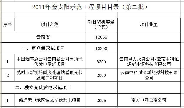 根据各地上报的《2011年金太阳示范项目实施方案》和专家评审结果,财政部、科技部、国家能源局确定纳入2011年金太阳示范工程的项目(第二批),总规模为247兆瓦,现予以公布。