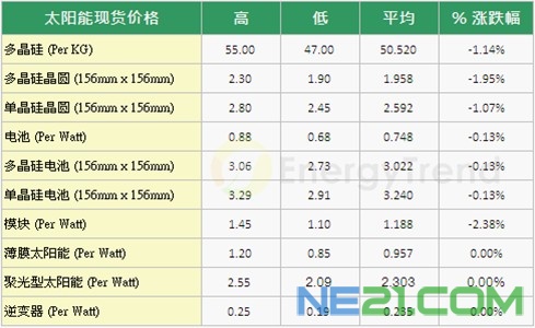 由于市场需求力道不如预期,下游厂商目前对于现货需求的明显降低,已对现货报价产生巨大的压力,虽然现货的主流价格仍力守在$50/kg的关卡,但已有厂商开出$47/kg的价格,因此EnergyTrend认为九月多晶硅的平均价格跌破$50/kg的机率极大。根据本周的调查,平均成交价来到$50.5/kg,跌幅为1.14%。